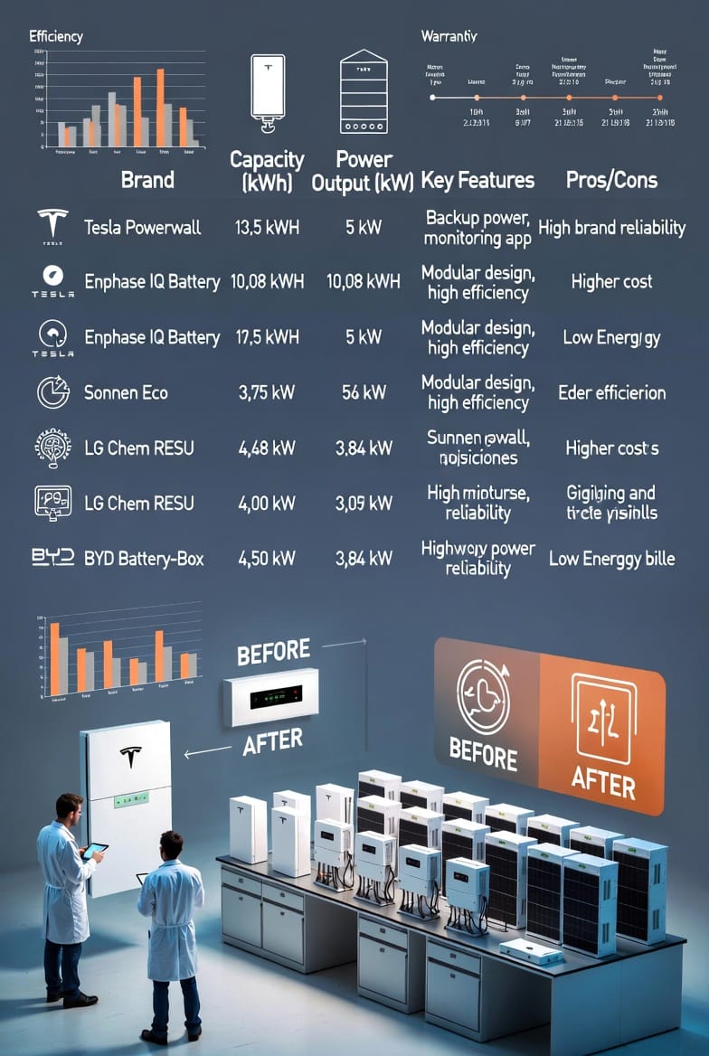 - Lithium-Ion (Li-Ion): Dominant choice for efficiency, depth of discharge (DoD up to 90%), and warranty (10+ years). Brands like Tesla and LG lead here.