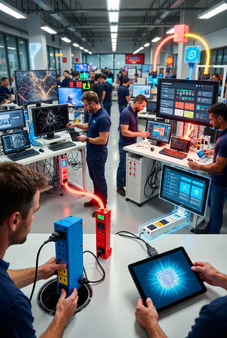 Explore in-floor power boxes for flexible layouts, providing pop-up access without permanent fixtures. Smart power strips add automation, allowing remote control via apps to power down idle devices, saving energy and extending lifespan.