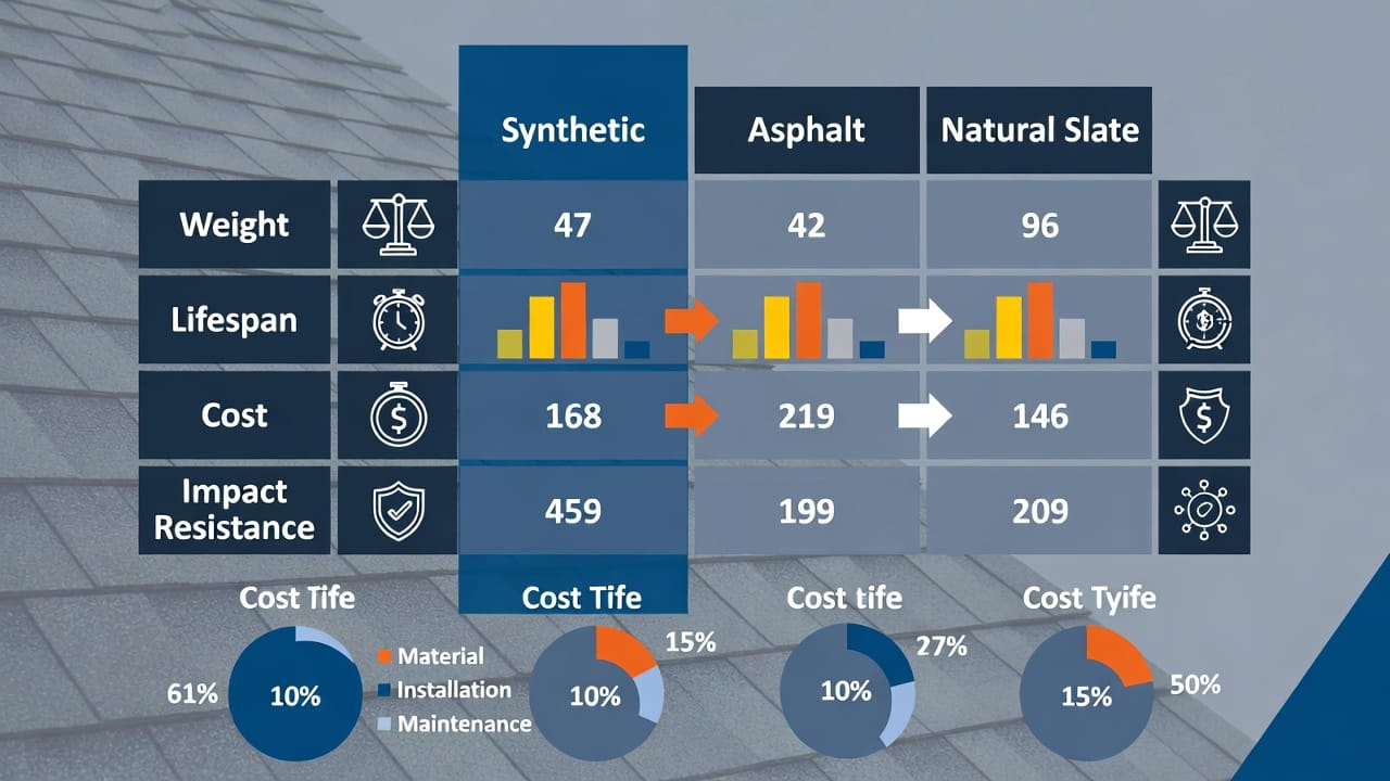 Synthetics balance performance and practicality, offering durability without slate's weight or asphalt's short life.