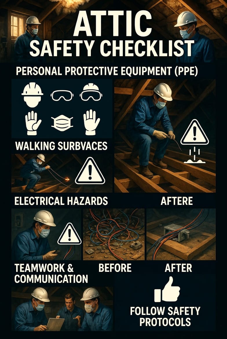 - Structural Awareness: Step only on joists or beams to avoid falling through the ceiling. Check for weak spots or water damage beforehand.