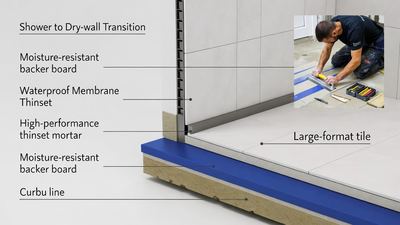 - Continuous tile over protected and unprotected areas – The same tile is installed over both the membrane-protected wet zone and the standard drywall in dry areas.