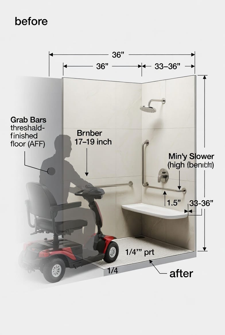 Accessible shower dimensions must balance code requirements with everyday comfort. A minimum 36-inch width allows easy wheelchair or walker entry while still feeling spacious for multiple users.