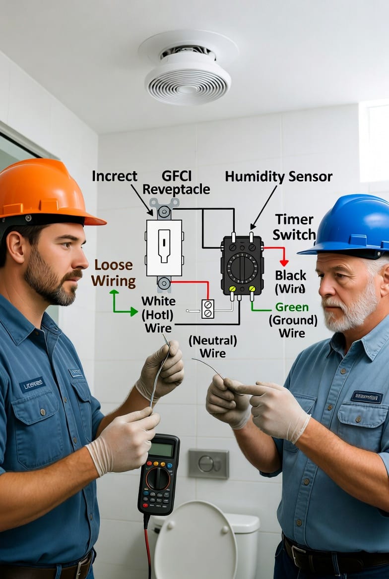 Warning: Improper electrical work on bathroom exhaust fans can lead to shock hazards, fire risks, failed inspections, and expensive repairs. Never compromise on GFCI protection, dedicated circuits, or proper wiring.