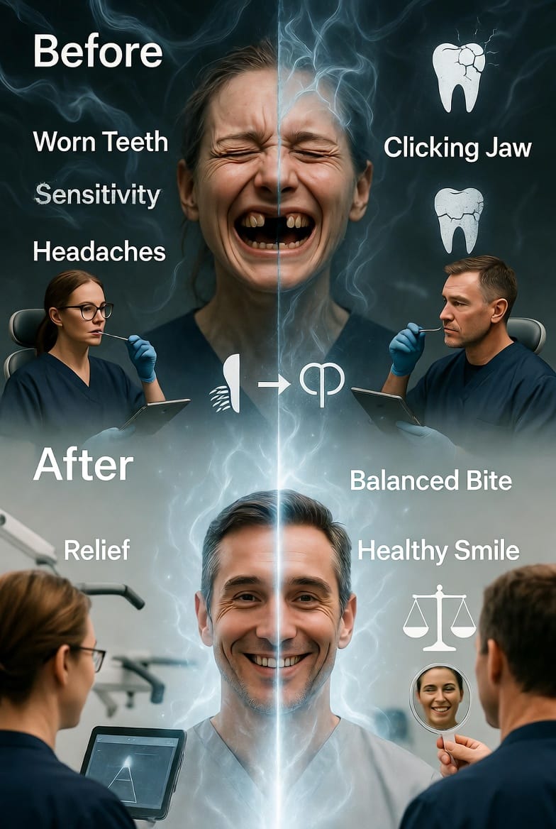 - Restorative dentistry: Crowns, veneers, or implants to rebuild worn teeth and improve occlusion.