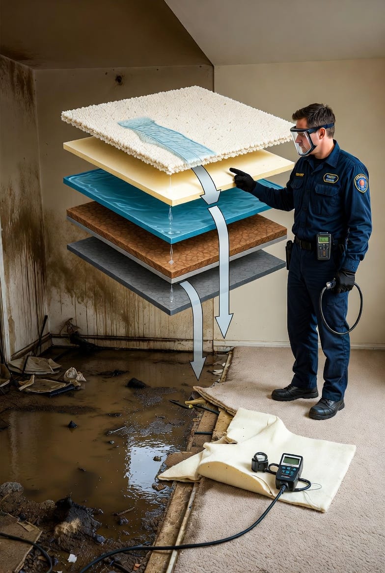 The science is straightforward. Carpet padding has low permeability once wet. Airflow from dehumidifiers and fans moves across the surface but cannot penetrate the dense, compressed material fully. Moisture meters may read acceptable levels on the carpet, yet the pad below remains damp for days or weeks.