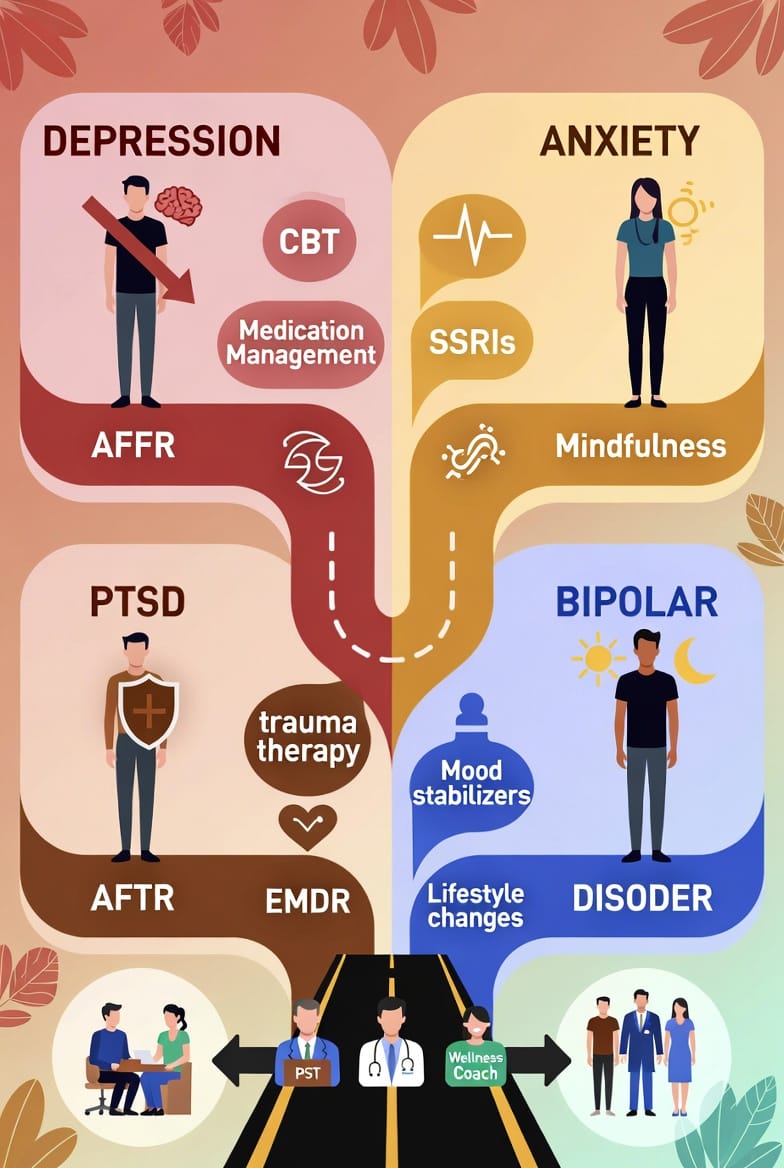 Several mental health disorders frequently appear alongside substance use. Recognizing them early is the first step toward effective dual-diagnosis care.