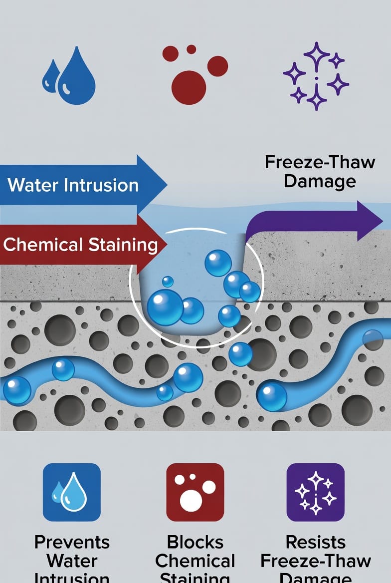 Sealing is not cosmetic—it is genuine maintenance that directly impacts longevity. Unsealed concrete is porous by nature. Water enters the surface, expands when it freezes, and creates micro-cracks. De-icing chemicals accelerate this process. Oil and gasoline stains become permanent without protection.