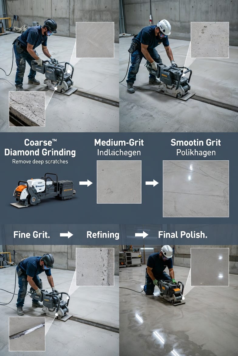 The true magic happens in the concrete polishing process itself. Four progressive stages gradually refine the surface from rough to radiant. Each phase uses specialized equipment and materials, building strength and beauty step by step.