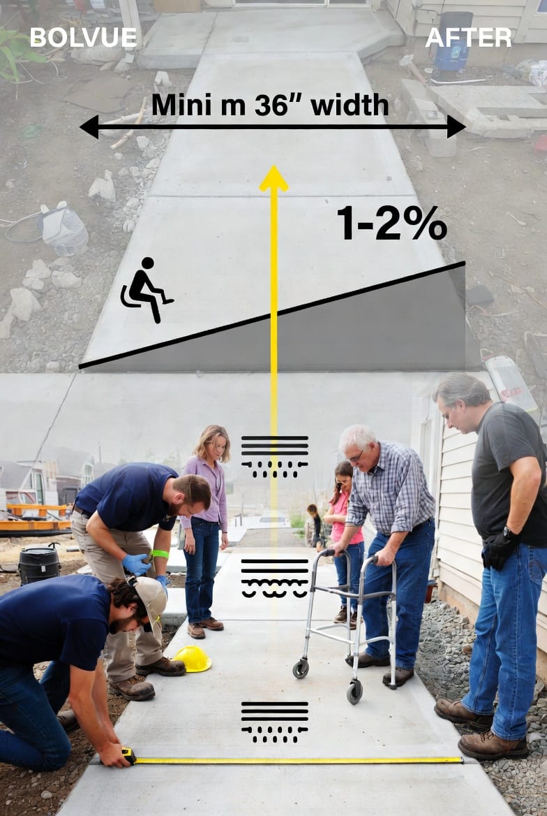 Thoughtful planning ensures the new walkway performs perfectly for decades. Minimum width should reach at least 36 inches to accommodate comfortable two-way traffic and mobility devices. The 1-2% slope away from the house foundation prevents water intrusion while remaining nearly imperceptible to walkers.