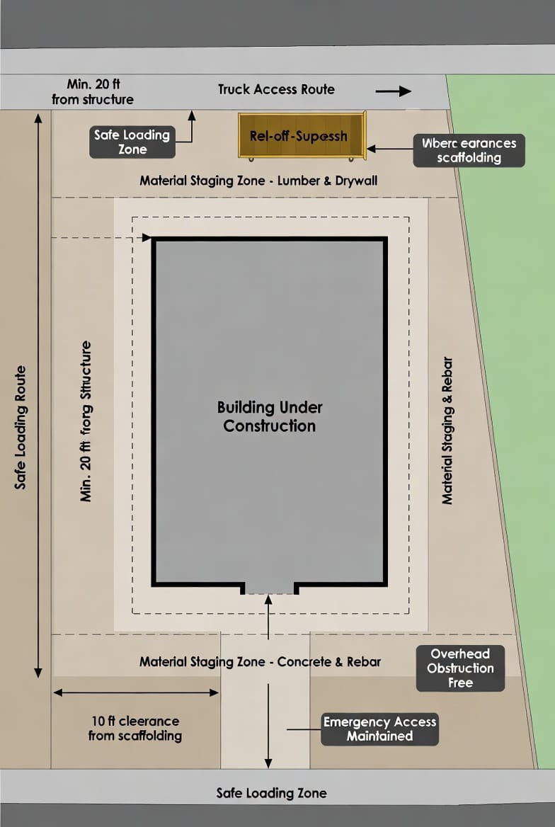 - Avoid blocking material staging, equipment paths, or scaffolding access.