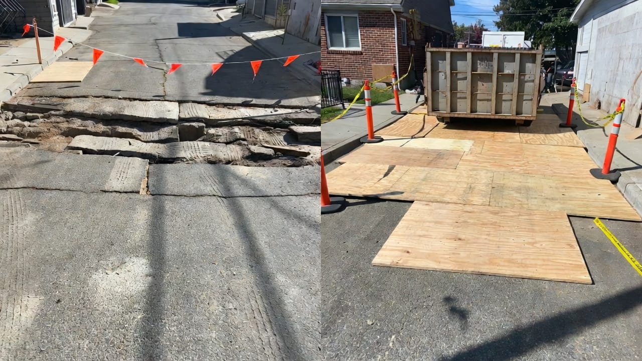 - Extend plywood well beyond the dumpster footprint to distribute weight evenly.
