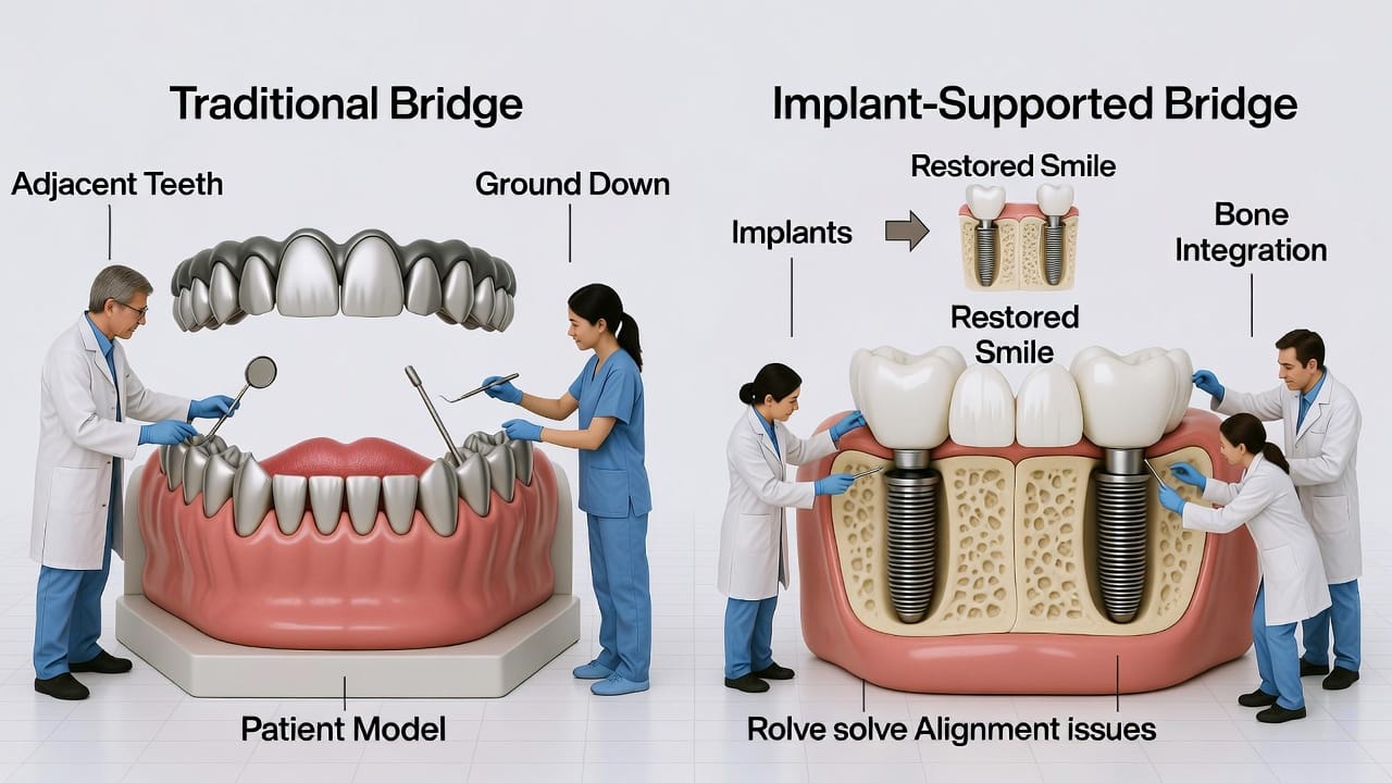 - How It Works: Implants fuse with the bone through osseointegration, providing a stable foundation without relying on neighboring teeth. The bridge is then attached to these implants.