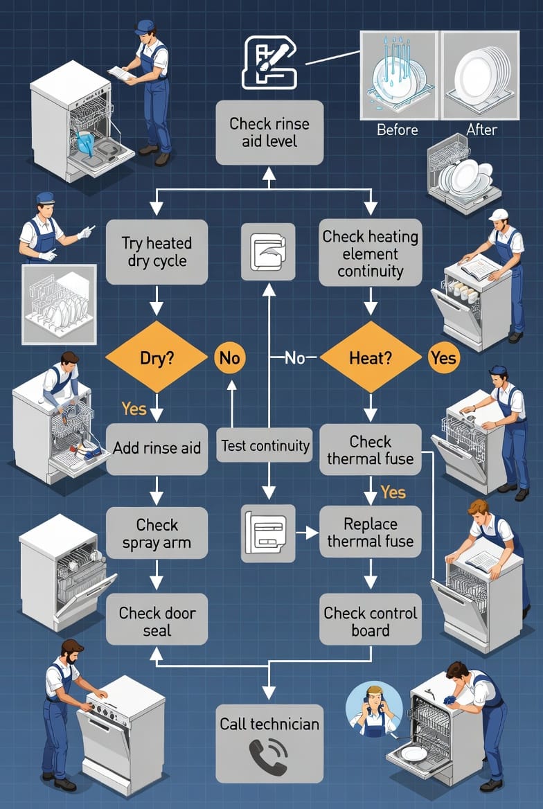 The dishwasher drying dilemma is frustrating, but rarely catastrophic. By checking rinse aid, selecting the right cycle, and knowing the signs of a failed heating element or thermostat, most homeowners resolve it quickly. For anything more involved — accurate diagnosis, safe part replacement, or warranty-friendly service — professional help is the wisest move.