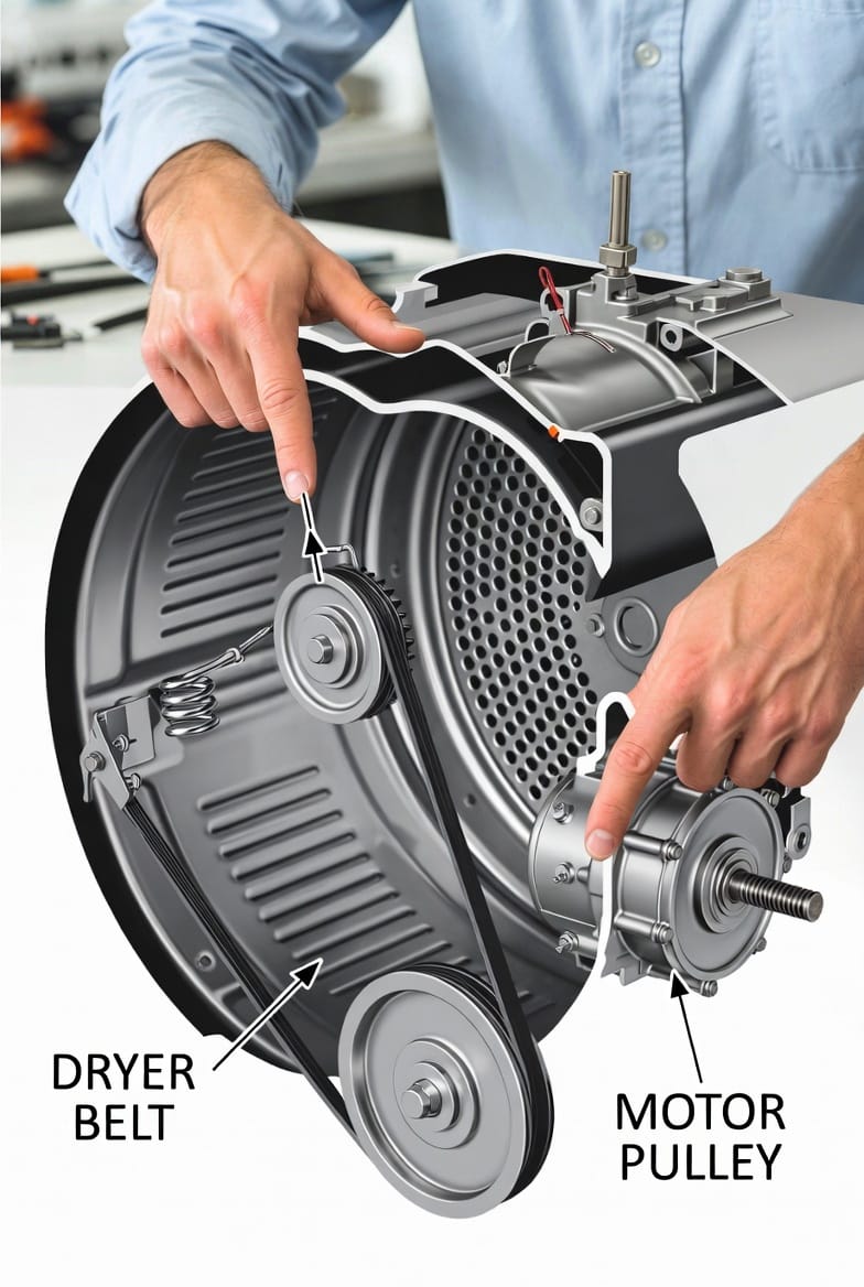 Bold fact: A single broken belt halts the entire tumbling action even while the motor continues to run and heat is produced. This mismatch is your first clue that the belt – not the motor or heating element – is the culprit.