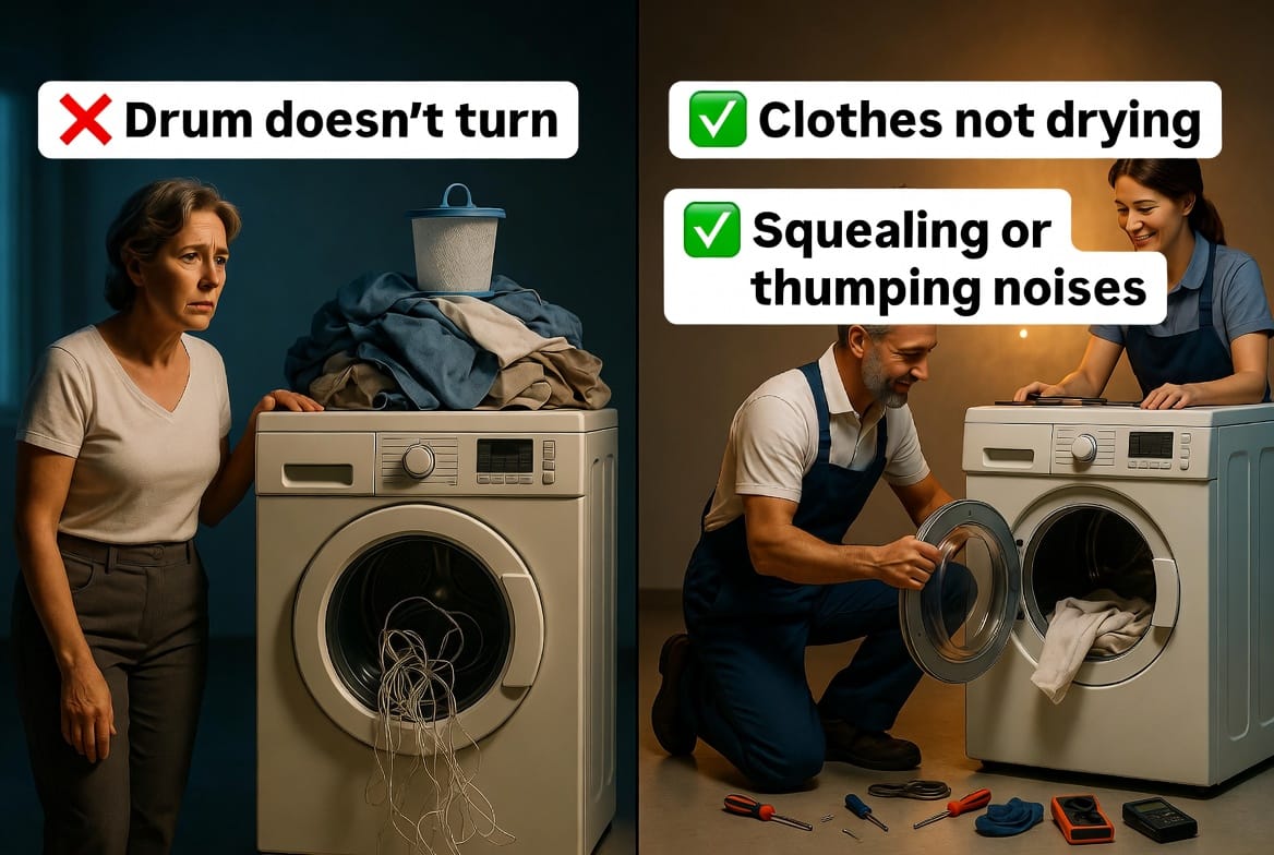 These indicators are unmistakable once you know what to listen and look for. The motor continues running because it is not directly affected, but without the belt connecting it to the drum, your clothes simply sit there. This is not a major breakdown – it is a focused component failure that our team resolves in under an hour in most cases.