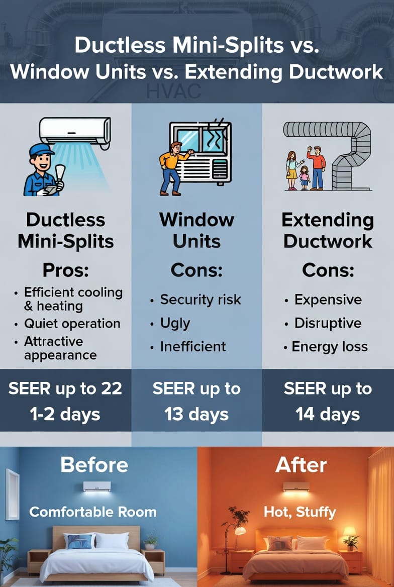 When facing uncomfortable additions or problem rooms, homeowners usually consider three main alternatives: window units, portable air conditioners, or extending existing ductwork. None match the performance and aesthetics of ductless mini-split systems.