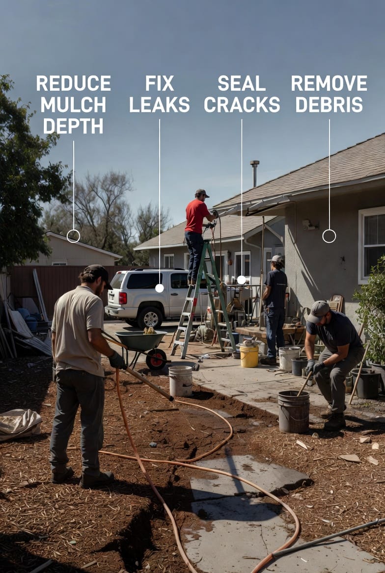 - Fix leaks immediately—repair dripping faucets, downspouts, and air-conditioner condensation lines