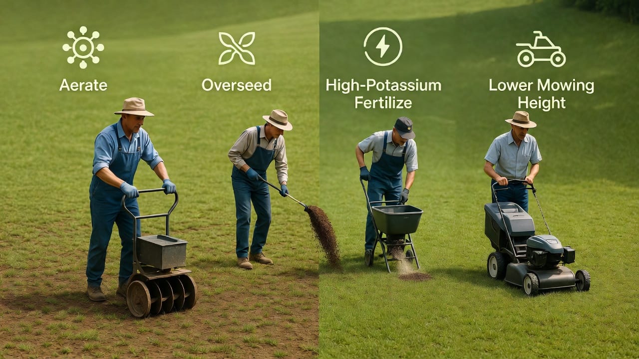 Overseeding fills thin spots and increases density. Choose a seed blend matched to your grass type, spread evenly after aeration, and keep the area lightly moist until germination. Combined with high-potassium fertilizer, these steps create a thicker lawn that naturally crowds out weeds.