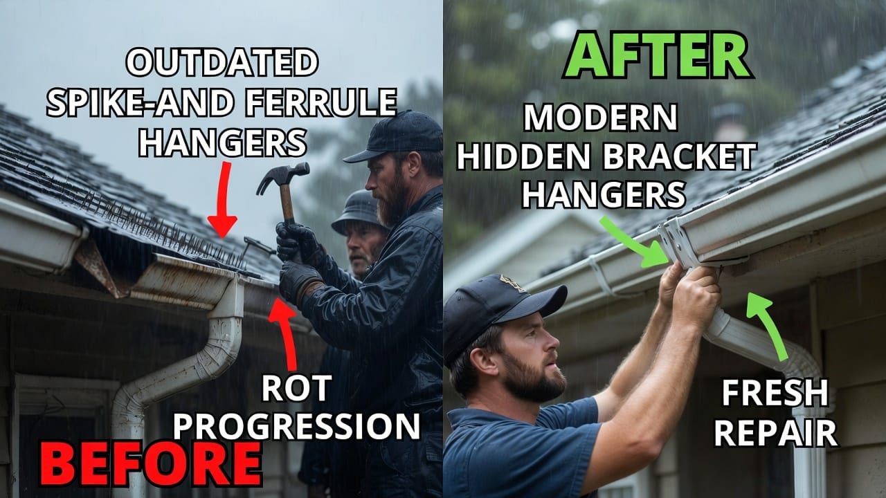 - Improper Installation and Fasteners: Many older homes use spike-and-ferrule systems to attach gutters. These long nails penetrate deep into the fascia and rafters, but they create entry points for moisture. Over time, spikes loosen due to wind, snow loads, or thermal expansion, allowing water to seep in. This accelerates rot, as the holes act like conduits for dampness. In contrast, modern methods avoid such vulnerabilities, but we'll cover those later.
