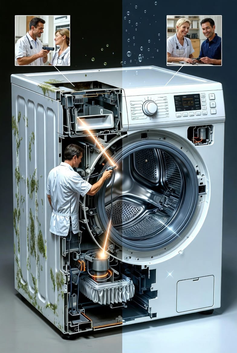 Certified technicians use specialized tools to disassemble the outer tub, clean hidden hoses, flush the drain pump, and apply antimicrobial treatments that reach areas homeowners cannot access. The process typically takes 60 to 90 minutes and restores full performance.