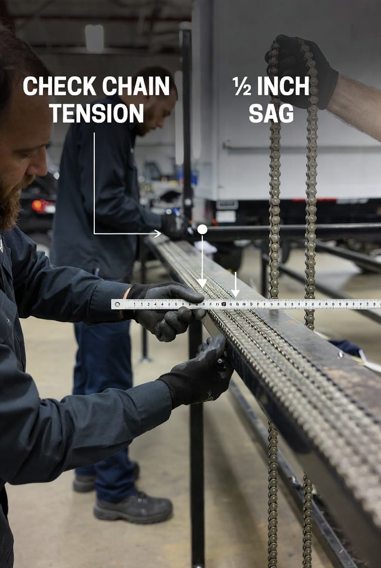 The industry standard for most chain-drive openers is ½ inch of sag at the midpoint of the chain when the garage door is fully closed. Here’s the simple verification process: