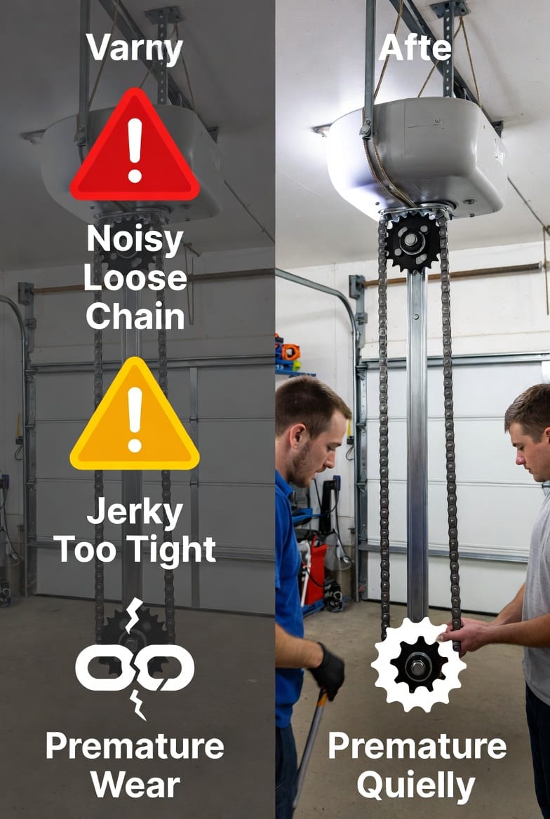 - Jerky or hesitant movement – The door starts and stops abruptly when the chain is too tight.
