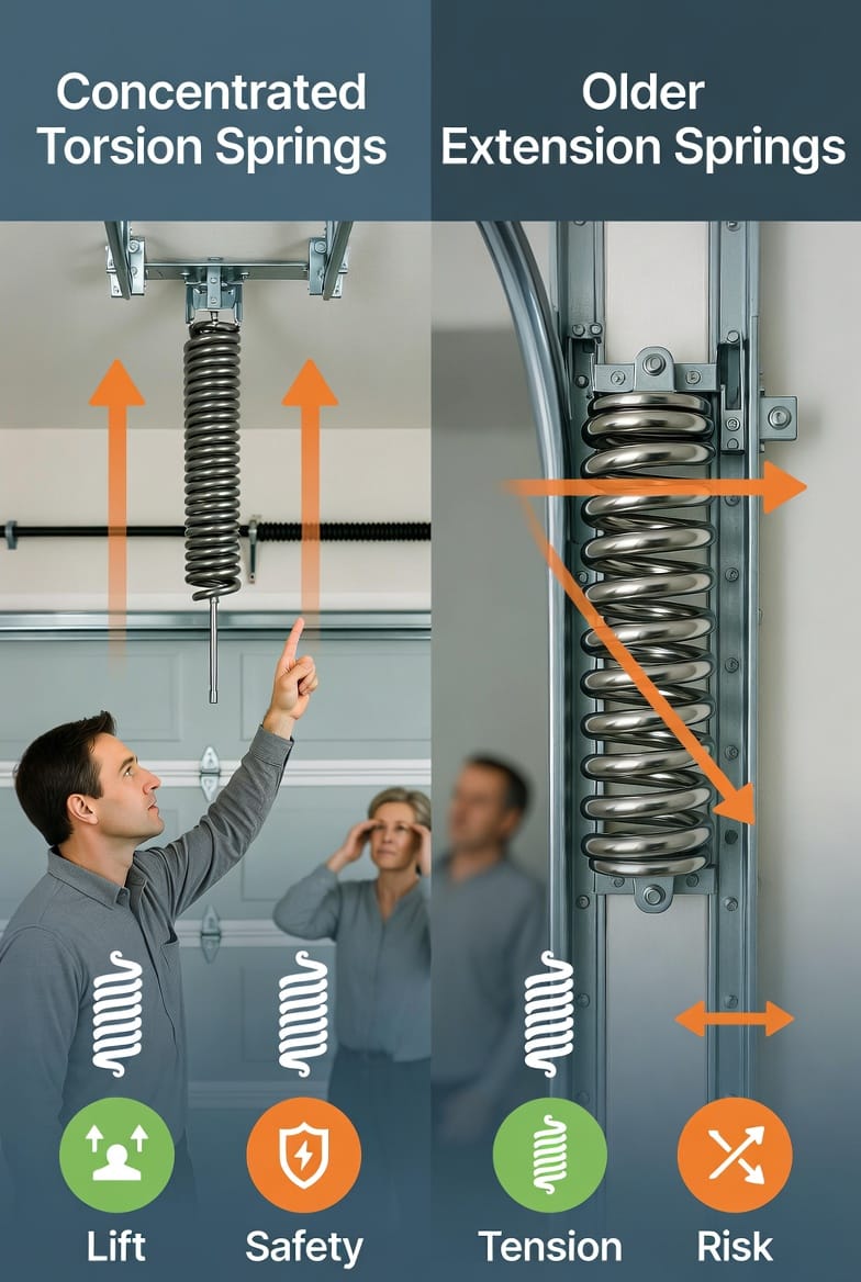 - Mounting Location — Torsion springs sit safely above the door on a shaft; extension springs run along the sides near the tracks.