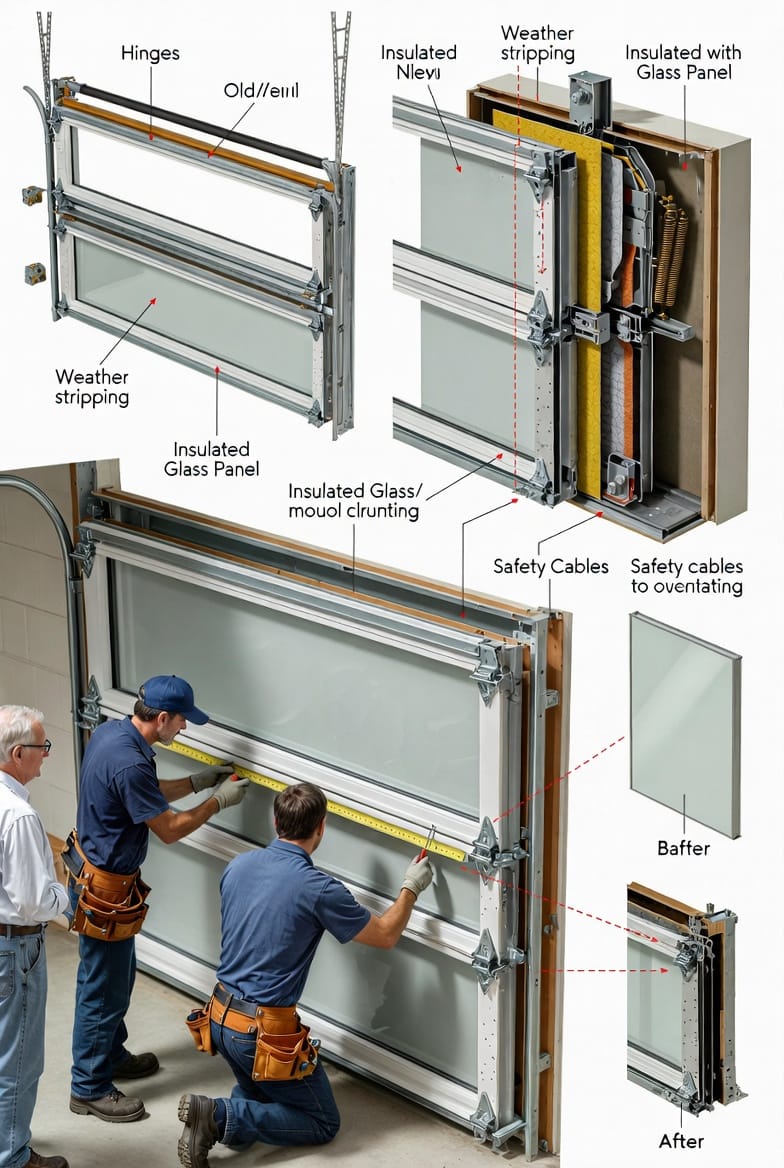Retrofit installation is the most popular choice for existing doors. Technicians carefully remove the center panel section and replace it with a pre-fabricated window insert module. The original door structure remains intact, preserving your investment. This method is cost-effective, minimally disruptive, and completed in just one day. The door’s balance and operation stay unchanged because the insert matches the exact weight and dimensions of the removed panel.