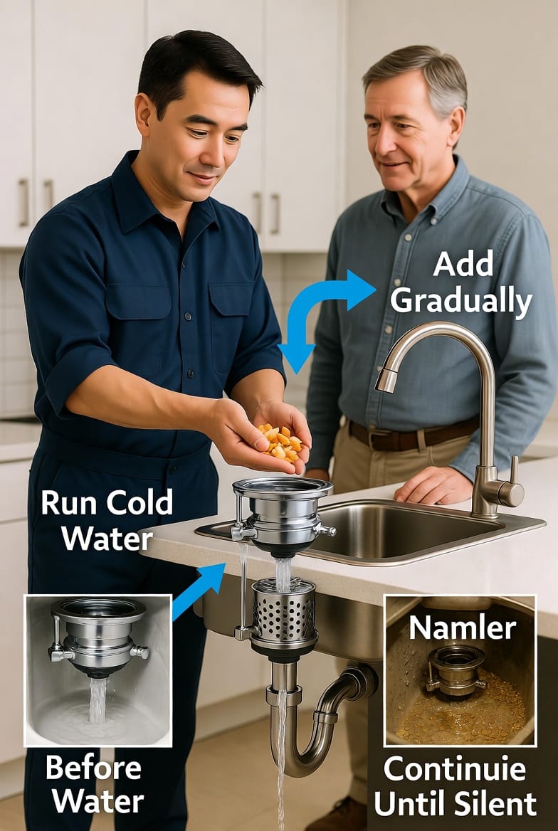 Never run the disposal dry. Water lubricates the chamber and flushes particles away. Overloading or “batch feeding” large amounts at once is one of the fastest ways to cause a jam.