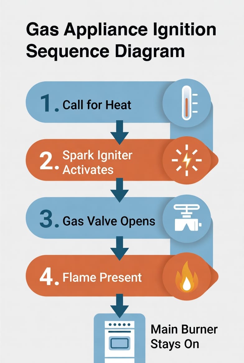 Any interruption in this precise chain triggers a safety lockout — a built-in safeguard preventing unburned gas accumulation.