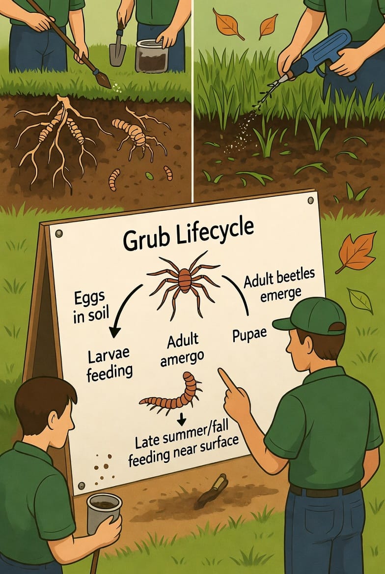 - Larval Stage: Eggs hatch into tiny grubs that begin feeding on roots. By late summer/fall, they're larger and nearer the surface—prime time for detection and treatment.