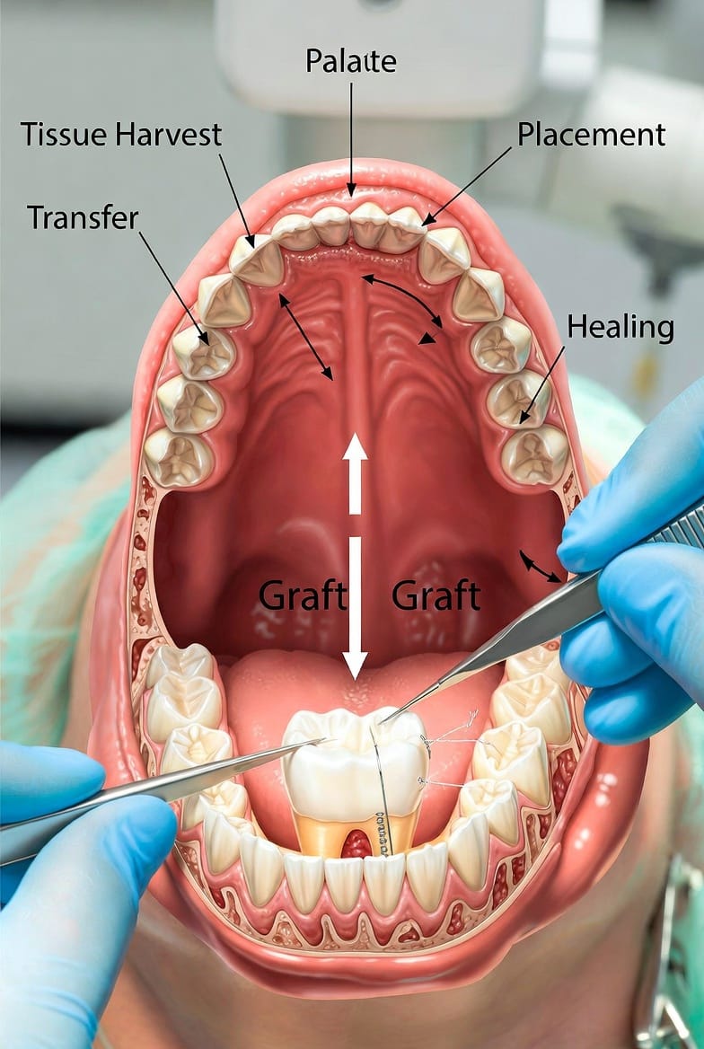 - Graft Placement – The harvested tissue is positioned over the root and secured with fine sutures.