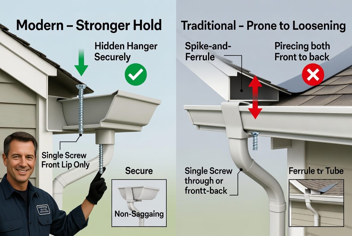 Your gutters are only as strong as the brackets holding them in place. Modern hidden hangers offer a clear upgrade over traditional spike-and-ferrule systems in strength, durability, appearance, and long-term reliability. By choosing the smarter attachment method, you safeguard your home, reduce maintenance headaches, and maintain beautiful curb appeal.