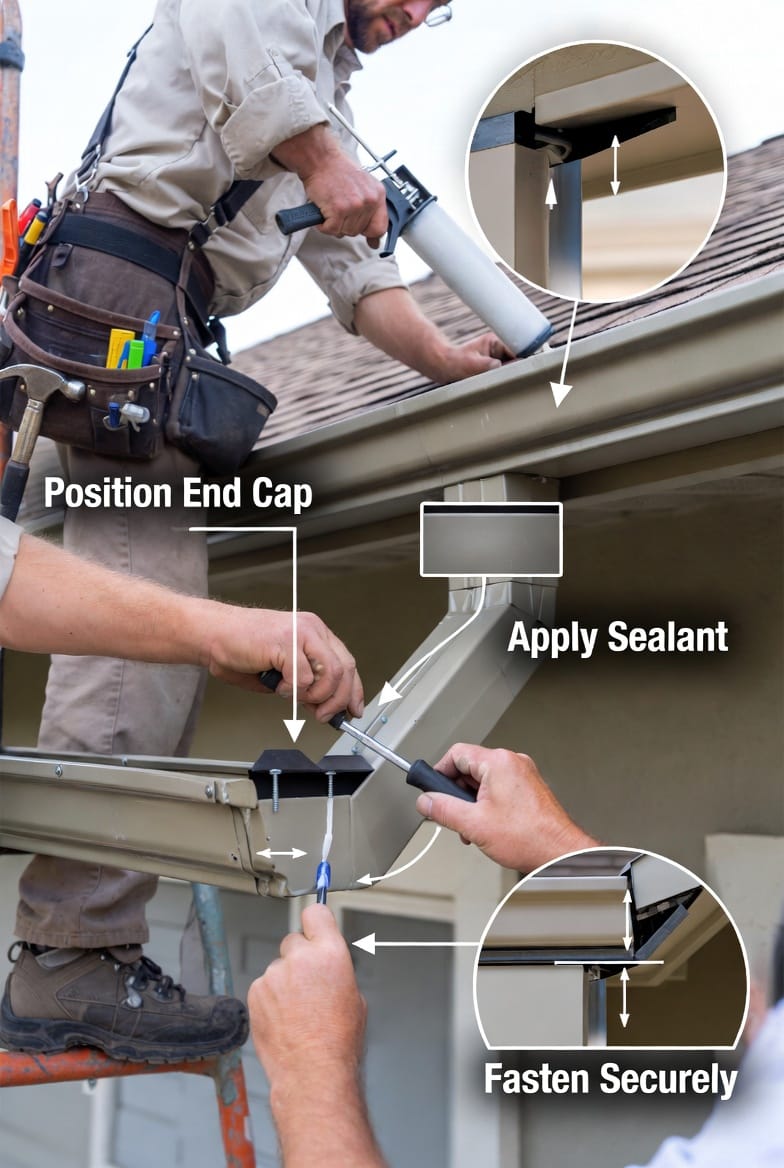- New end cap replacement delivers the most reliable, long-term fix. Professionals remove the failed component entirely, clean the gutter end, and install a precisely matched new cap using both mechanical fasteners and industrial-grade sealant. This restores the system to original or better performance.