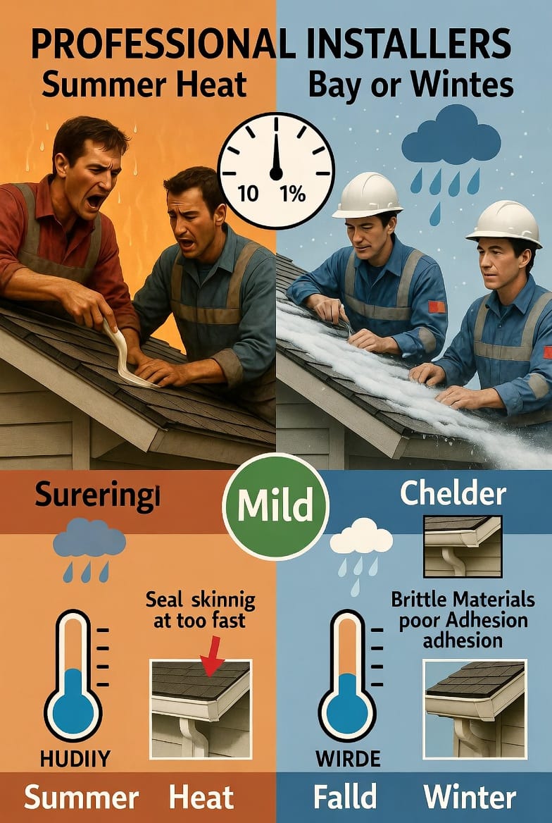 - Temperatures between 50-80°F – the sweet spot for proper sealant curing and crew comfort