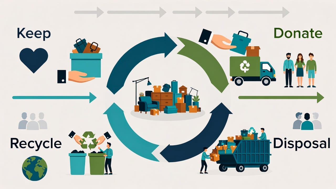 - Compassionate Sorting – Items are carefully divided into Keep, Donate, Recycle, and Disposal categories. Sentimental pieces receive extra time and respect.