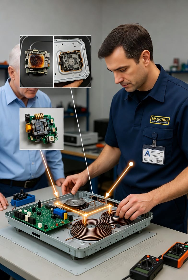 Power modules and IGBT transistors (the high-speed switches that control current to the coils) also degrade. These failures often produce buzzing sounds, uneven heating, or sudden tripping of household breakers. Each component interacts tightly; a fault in one area frequently stresses others, turning a single issue into a cascade of problems.