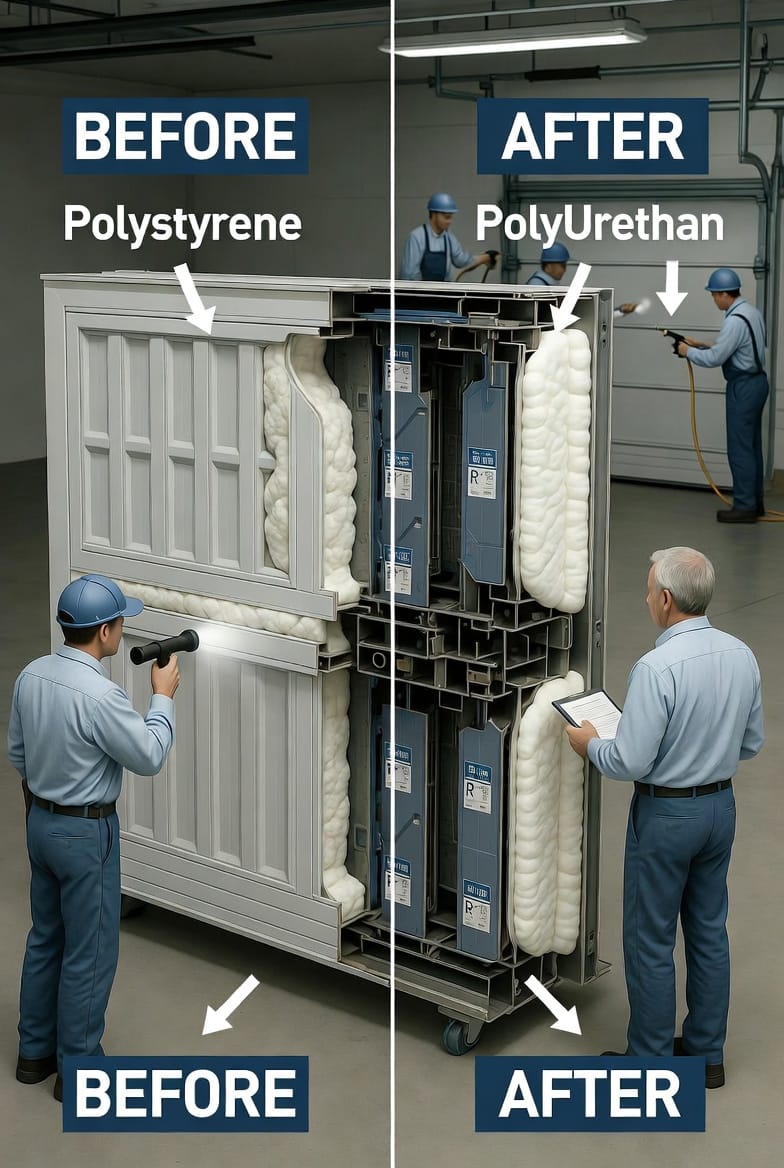 Enter polyurethane foam, which is injected as a liquid and expands to conform to the door's shape. This creates a seamless, high-density barrier with R-values up to 18 per inch, offering better resistance to heat transfer and cold infiltration. Polyurethane also adds structural strength, making the door quieter and more resistant to dents.