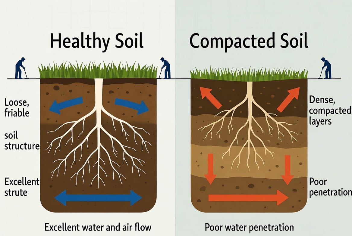Compacted soil feels hard underfoot and drains poorly. Grass roots struggle to penetrate the dense layer, leading to shallow root systems that dry out quickly during summer heat. Over time, the lawn becomes thin, patchy, and far more susceptible to disease and weeds.