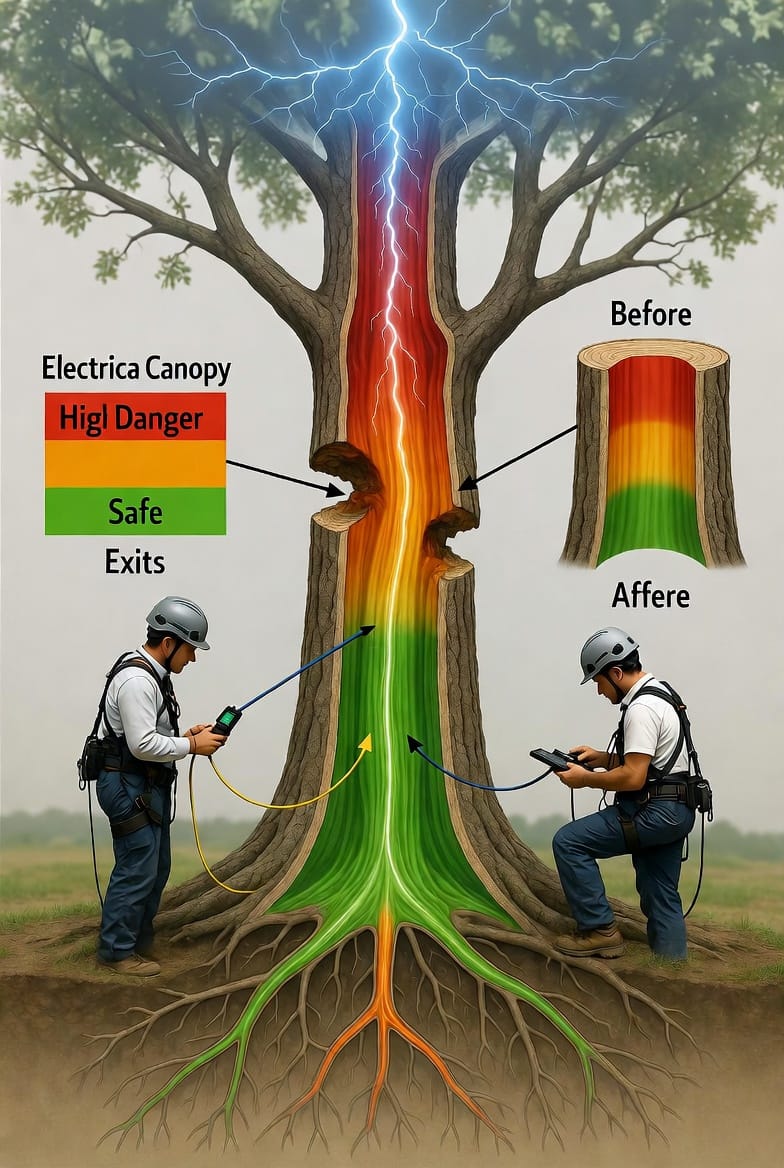 A compromised root plate turns even a partially damaged tree into a safety hazard. During high winds or saturated soil conditions, the risk of failure multiplies. Professional lightning strike assessment includes root-zone excavation and ground-penetrating radar when necessary to determine underground health accurately.