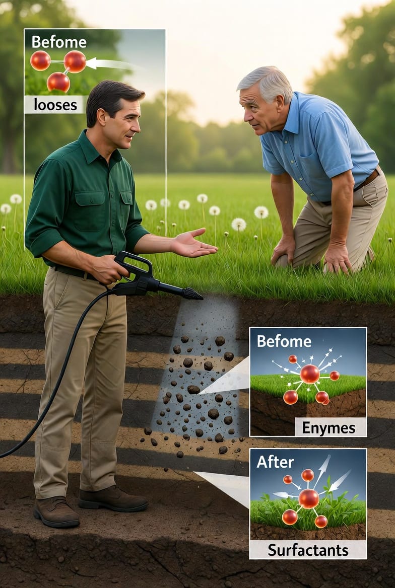 Surfactants help the solution penetrate deeply and evenly, while enzymes accelerate the decomposition of thatch and organic matter that contributes to compaction. Over time, this process creates microscopic channels and improves soil structure naturally – all without removing any soil or creating surface holes.
