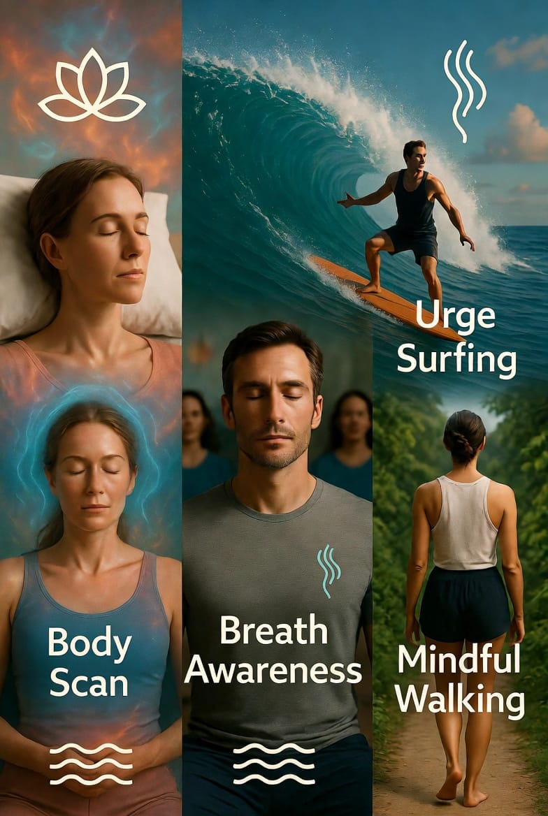 - Body Scan: A systematic mental sweep from head to toe that increases bodily awareness and releases stored tension. Practiced regularly, it helps you notice early physical signs of stress or craving.
