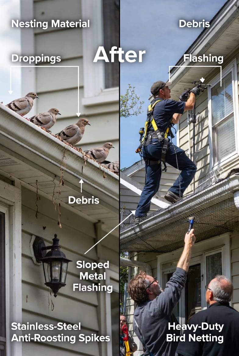- Bird netting installed over gutters and eaves creates a physical barrier while remaining nearly invisible from the ground.