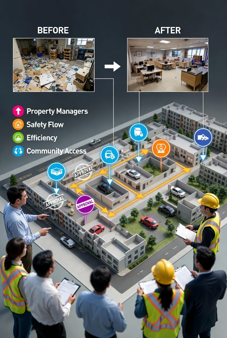Apartments and condominiums present distinct challenges compared to single-family home cleanouts. High tenant density means more waste volume generated simultaneously. Shared spaces like parking lots, common areas, and service roads require careful dumpster placement to avoid disrupting daily life.