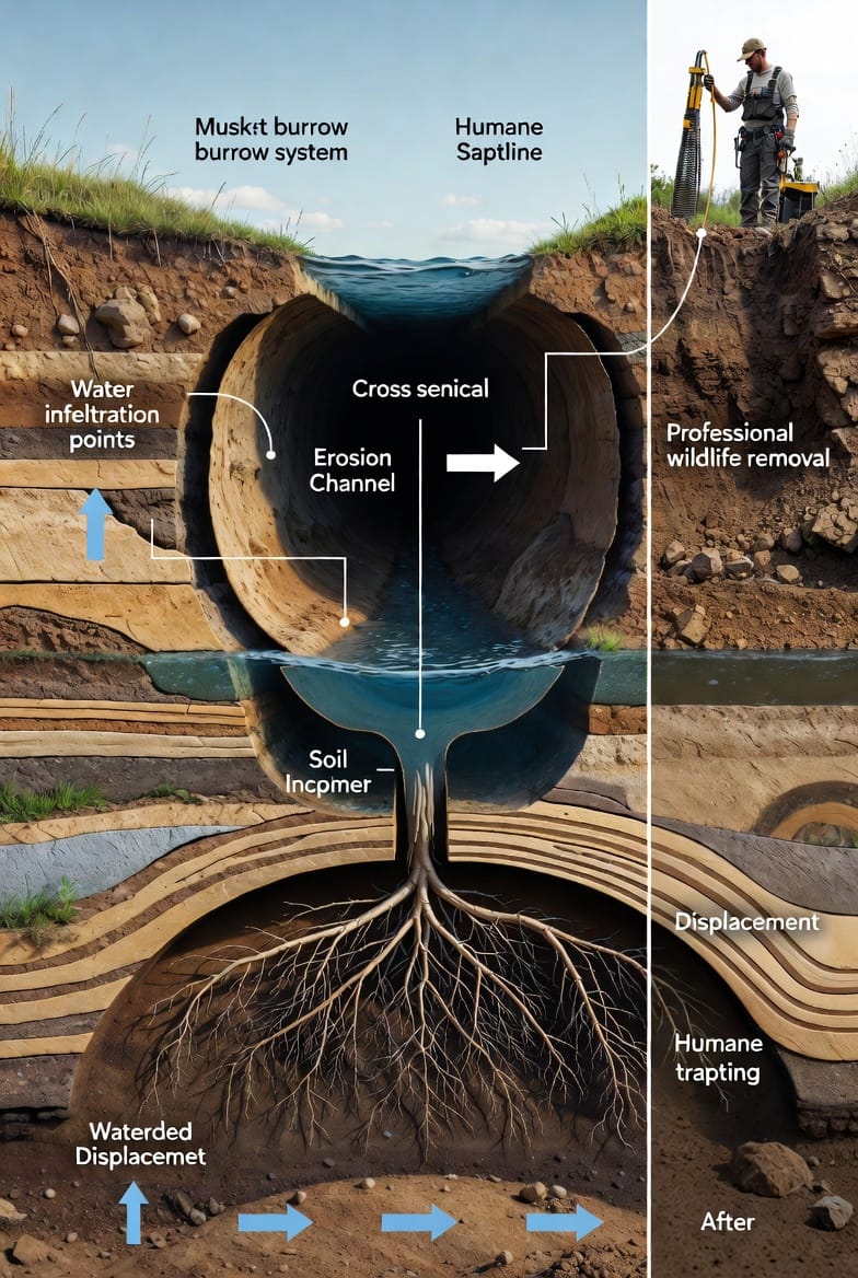 Burrowing activity intensifies during spring and fall when muskrats prepare for breeding or winter survival. They prefer soft, moist soils typical of well-maintained ponds and water features, making residential waterfront properties especially attractive. Understanding these patterns allows property owners to anticipate problems before visible damage appears. Our specialists have observed that early detection dramatically reduces both repair costs and the scope of intervention required.