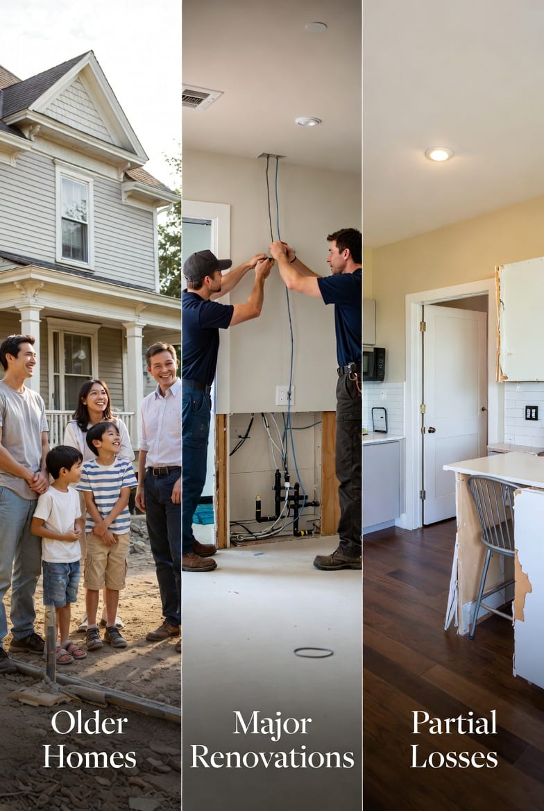 Imagine a kitchen fire that damages walls and wiring. Your insurer approves replacement of the damaged drywall and old wiring – but only to the original 1990s standard. If your city now requires arc-fault circuit interrupters, upgraded smoke detectors throughout the home, or seismic reinforcements, those costs are excluded. This gap leaves many families facing bills ranging from $20,000 to well over $100,000 depending on the scope of work.