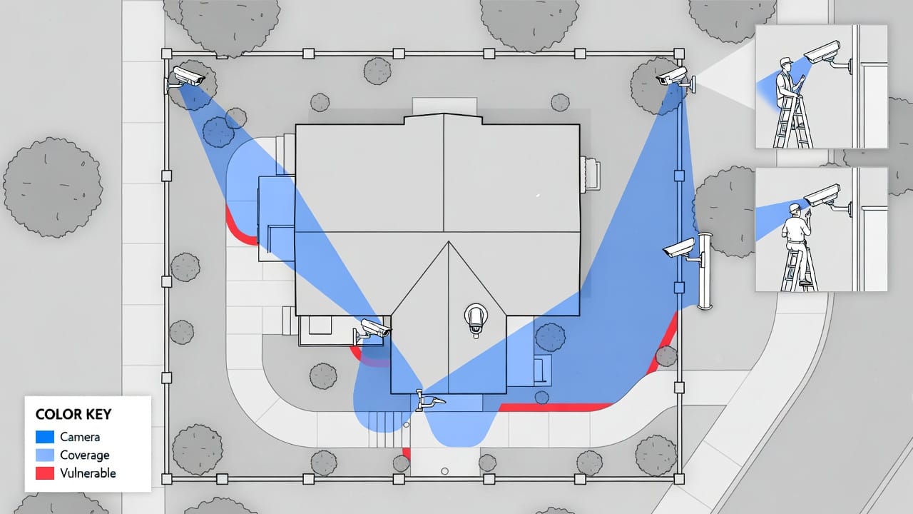 - Second-Story Overlooks: Use upper-level windows or soffits for elevated perspectives that capture larger portions of the property, reducing the total number of cameras required.