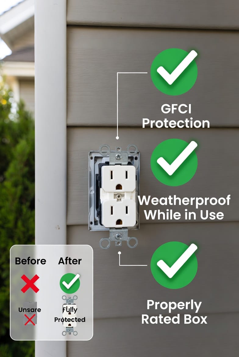 A standard weatherproof cover works only when nothing is plugged in. Once you insert a cord, that cover must stay open—leaving the outlet exposed. This is where in-use weatherproof covers, or bubble covers, become essential.