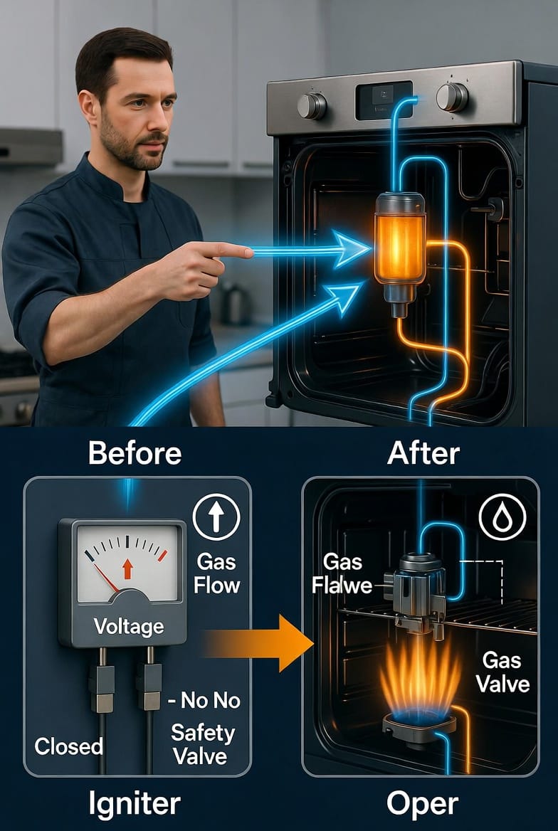 This current-draw mechanism is the built-in safety feature. A weak or failing igniter never generates enough amperage to open the valve, so gas never flows—even if the igniter still glows faintly. That is why you can see an orange glow inside the oven yet no heat is produced. Understanding this process removes the mystery and explains every symptom you may be experiencing.