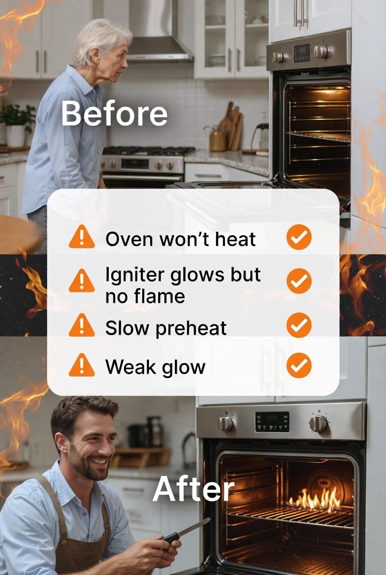 A failing oven igniter is one of the most common yet easily resolved gas oven issues. Once you recognize the signs—oven won’t heat, glowing but no flame, slow preheat, or weak glow—the solution is straightforward: professional oven igniter replacement.